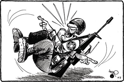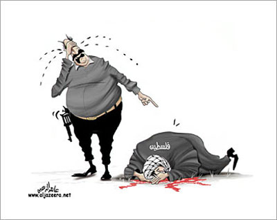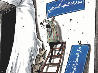 ترجمه تابلوی پائینی : مقر تشکیلات خودگردان و کابینه ، تابلوی بالائی : رنج های ملت فلسطین