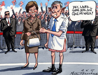 فكر مي كنم ترجمه كاريكاتور بوش نادرست باشه! اشاره بوش به دزديده شدن ساعتش در ديدار با مردم تيرانا در آلباني است !