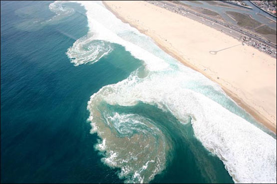 نمونهای از جریان شکافنده که آب از ساحل به سمت دریا باز میگردد