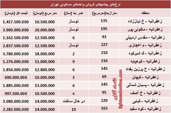 قیمت آپارتمان در زعفرانیه تهران (جدول)