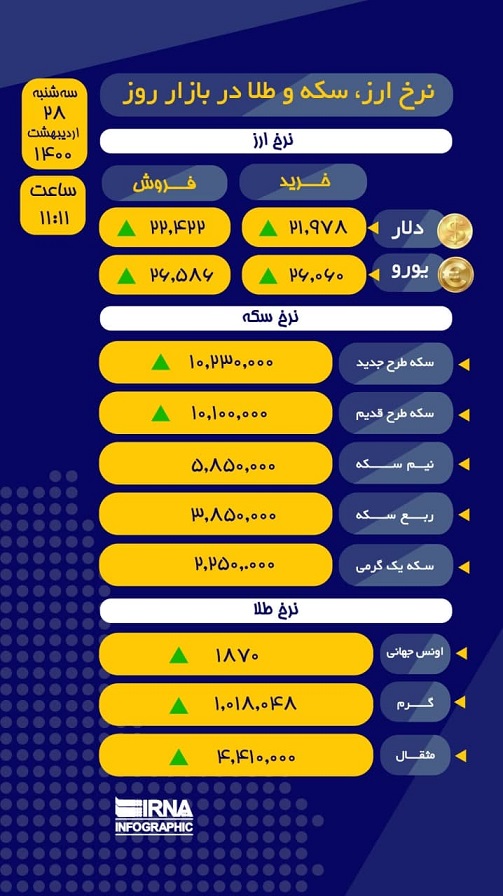 آخرین نرخ ارز، سکه و طلا در بازار (۱۴۰۰/۰۲/۲۸)