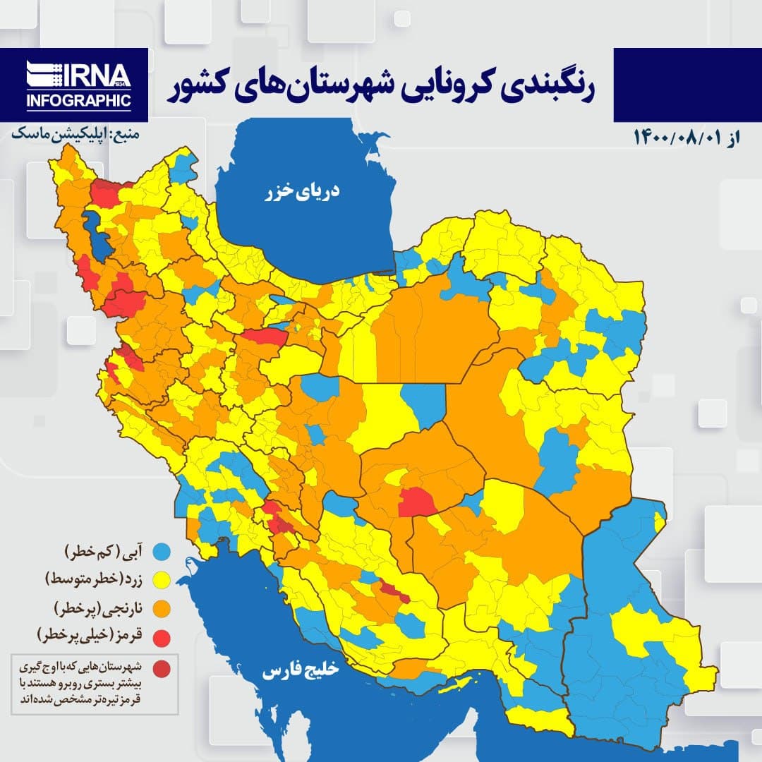 بر اساس آخرین تغییرات در نقشه رنگبندی شهرستان‌های کشور، شهرستان‌های قرمز به ۱۶ مورد افزایش یافته است. اکنون ۱۱۹ شهرستان در وضعیت نارنجی، ۲۲۷ شهرستان زرد و ۸۶ شهرستان آبی هستند.