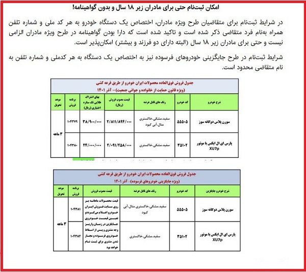 ابتدای این هفته خبر شرایط ثبتنام خودرو در طرح جدید یکی از خودروسازان خبرساز شد. در این طرح در قالب طرح ویژه مادران اعلام شد که مادران زیر 18 سالی که صاحب دو فرزند و یا بیشتر باشند،بدون داشتن گواهینامه میتوانند برای دریافت خودرو ثبتنام کنند.
